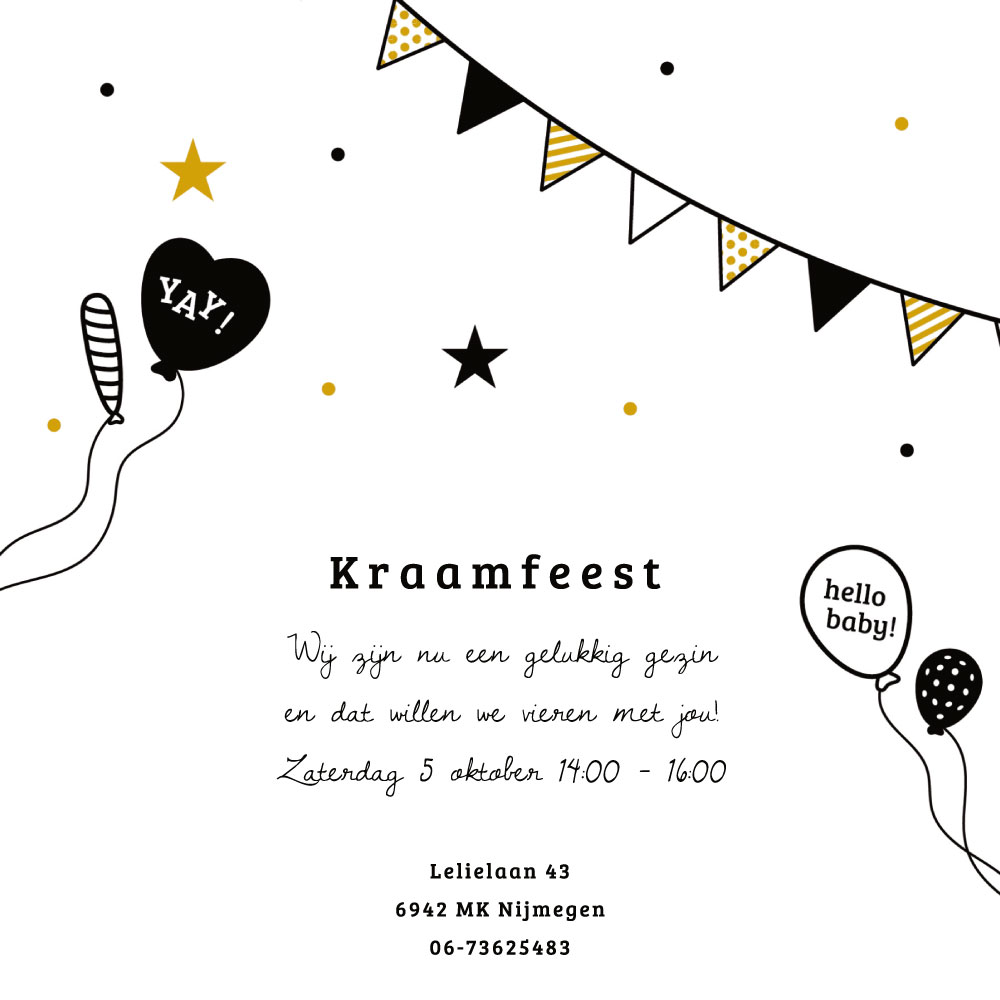 Geboortekaart Dolle Doordraaier met okergele vlaggetjes en sterretjes.