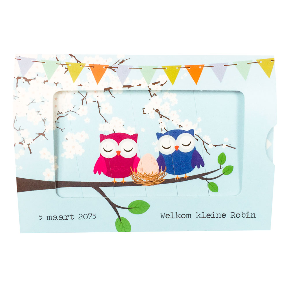 Schuifkaartje met een roze en blauw uiltje op een tak wachtend op het uitkomen van hun ei. Wanneer je de kaart uittrekt is het ei uitgekomen en komt het kuikentje tevoorschijn.